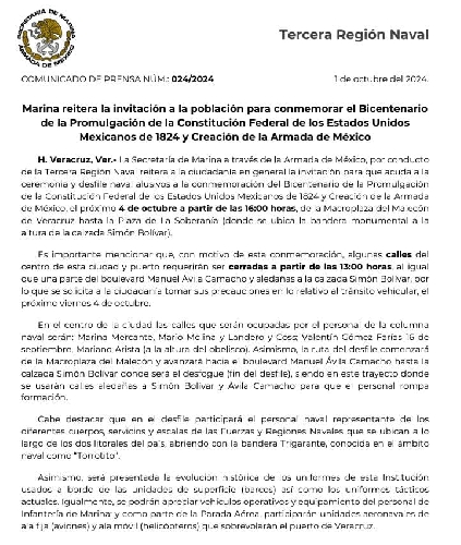 Marina reitera la invitación a la población para conmemorar el Bicentenario de la Promulgación de la Constitución Federal de los Estados Unidos Mexicanos de 1824 y Creación de la Armada de México